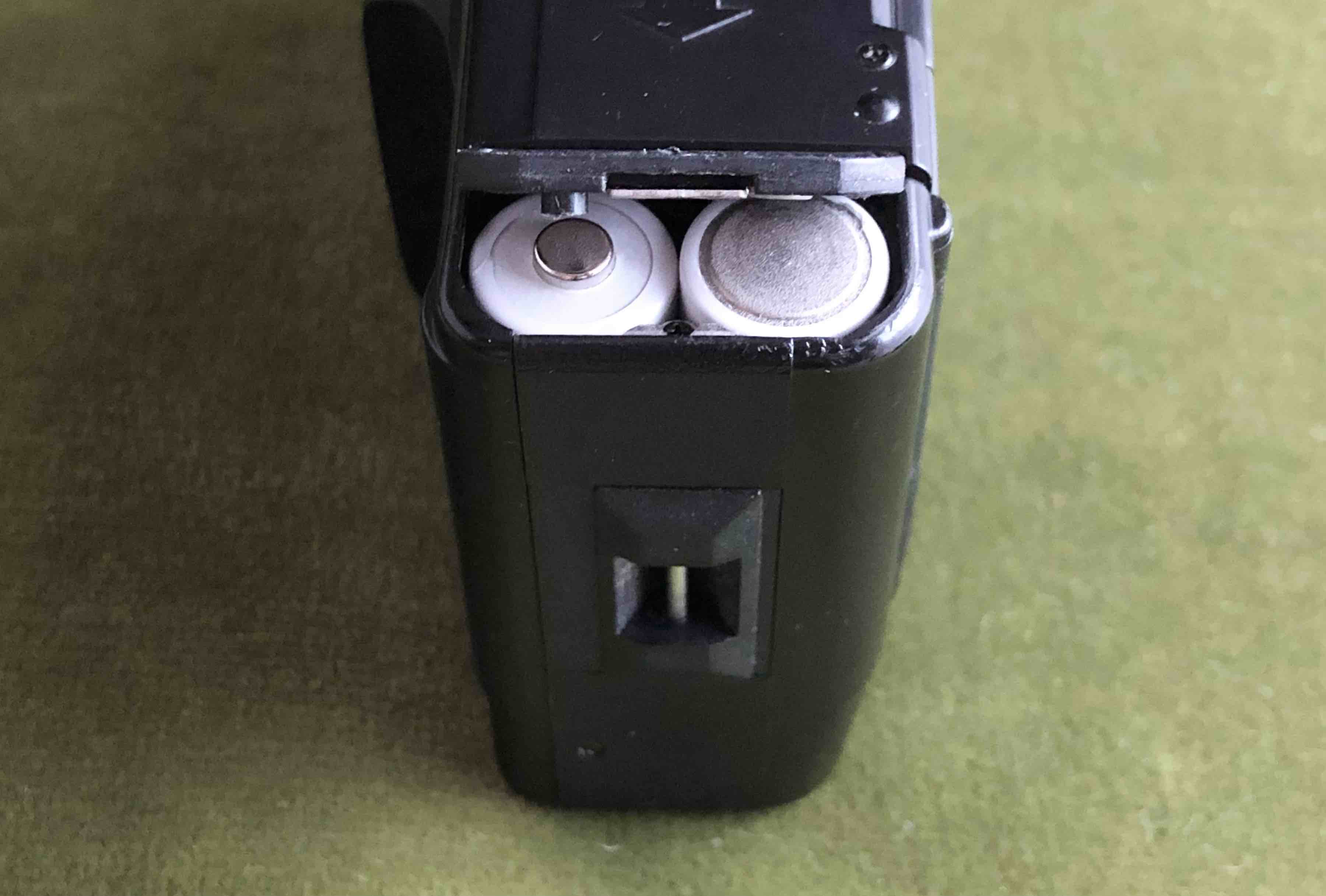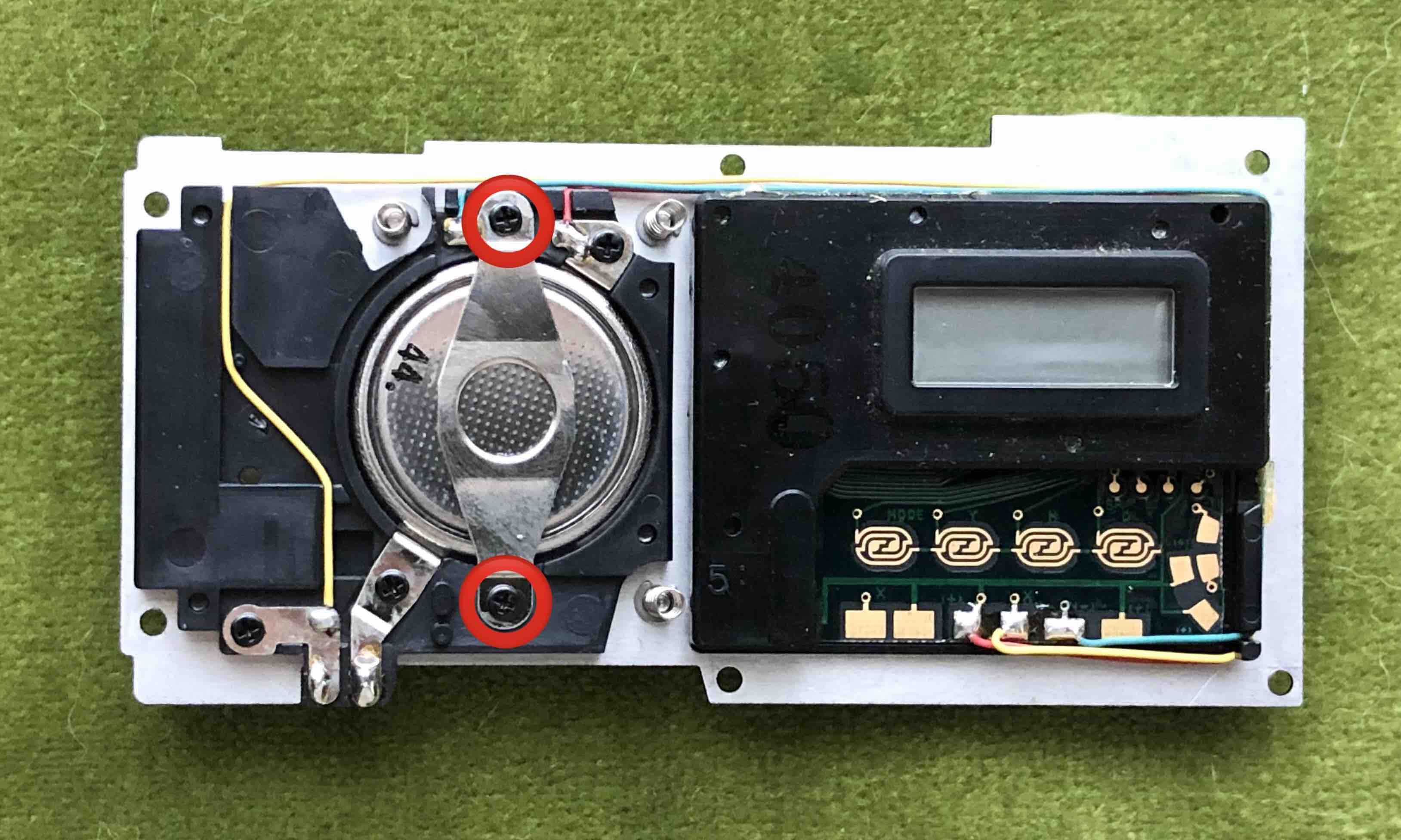❷取り外した部品の裏側です。ネジを2カ所緩め電池を交換します。