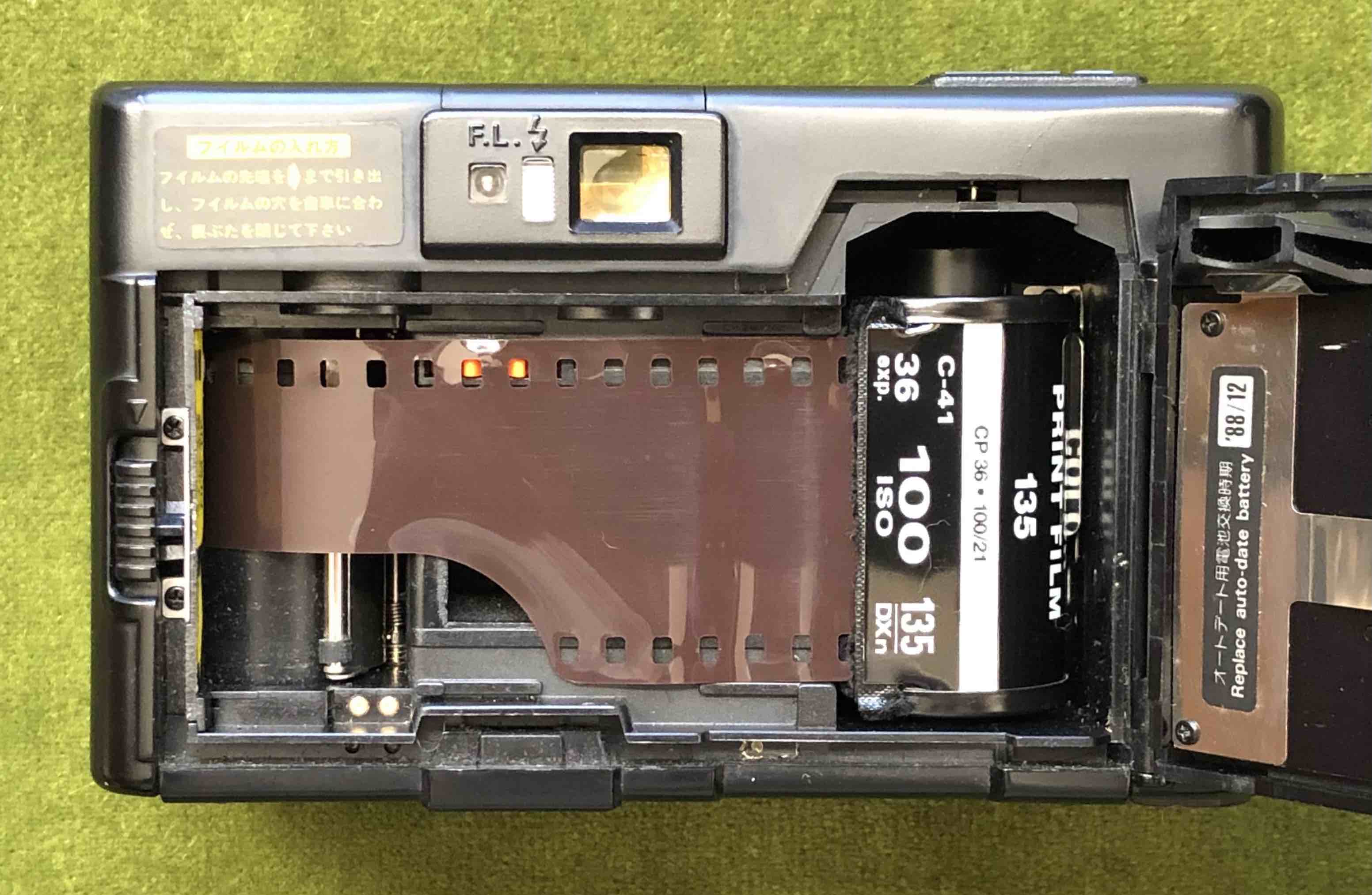 ❶裏蓋開閉スイッチで裏蓋を開けフィルムをセットします。