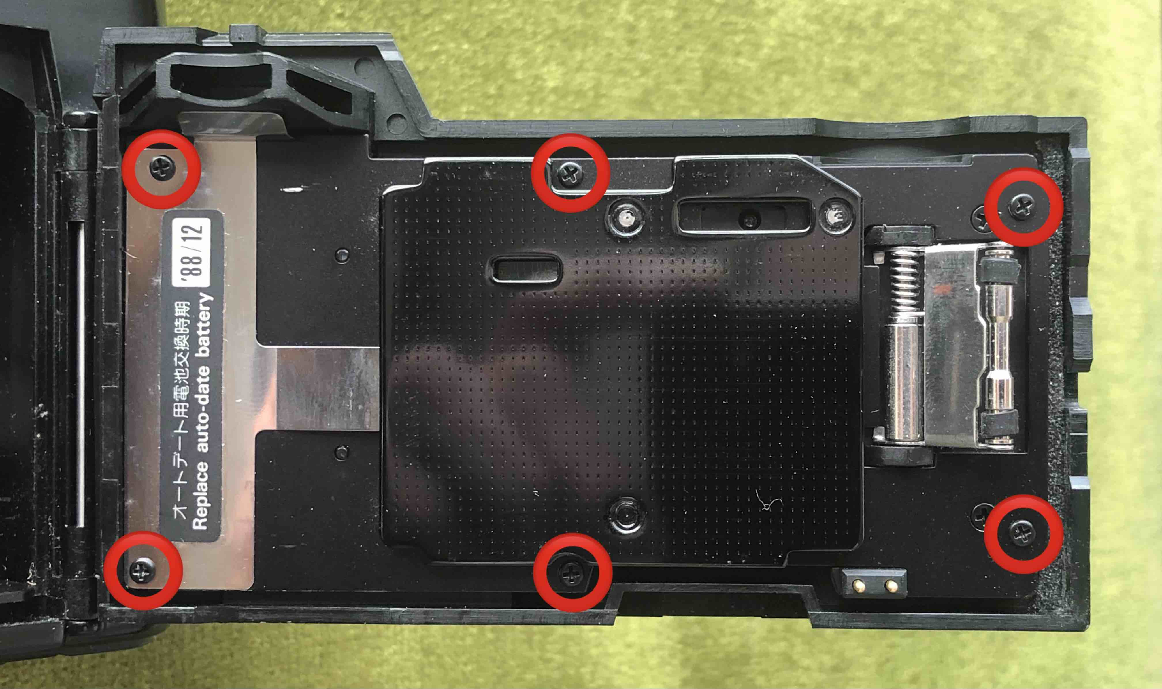 ❶デート用の電池を交換するには、裏蓋のネジを6カ所外します。