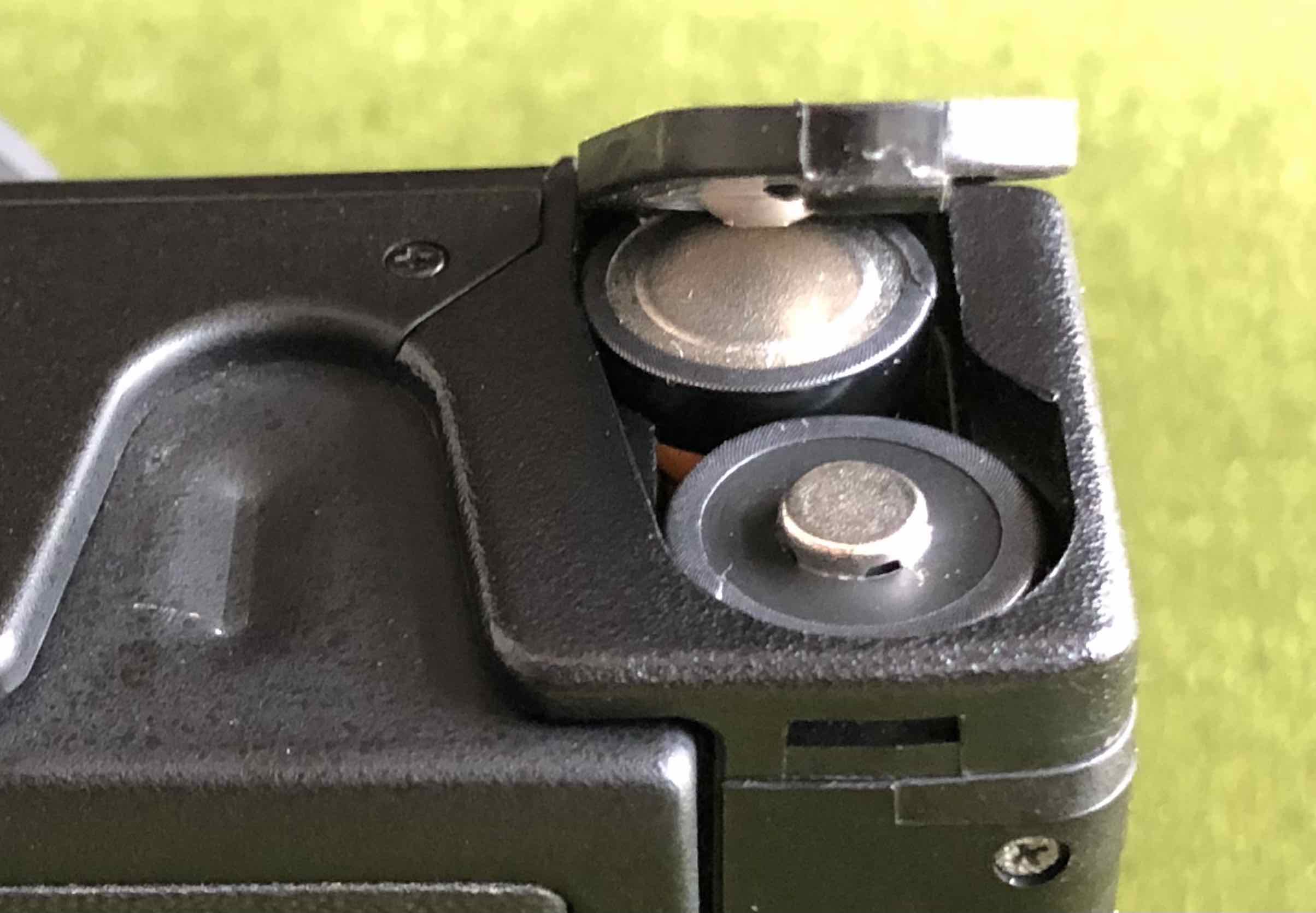 ❶電池室の蓋を開け、+ーの向きを間違えないよう電池(単3型2本)を入れます。
